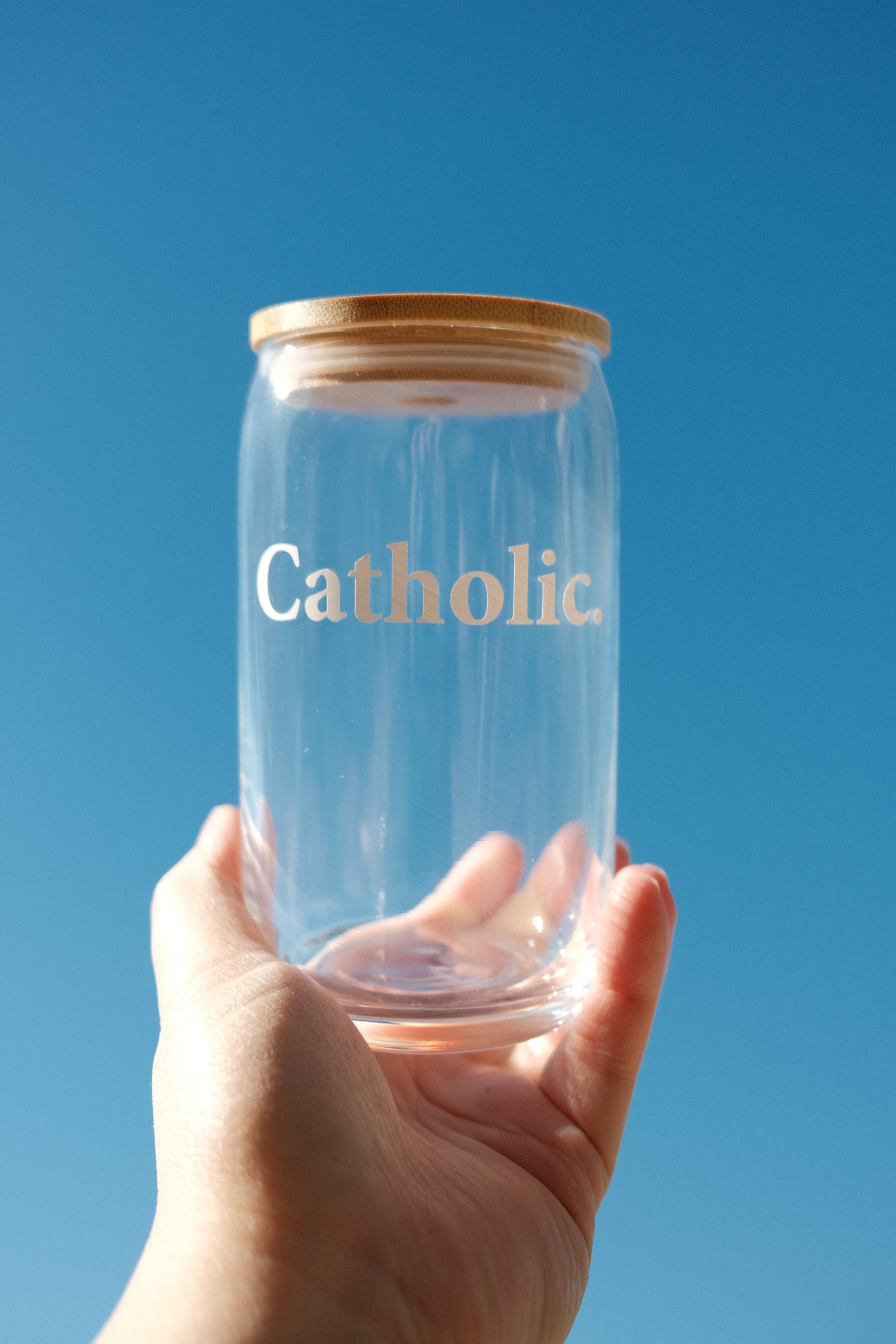 Elevate your daily drink with this beautifully crafted 16oz glass tumbler featuring a clean "Catholic" design in high-quality white vinyl. Thoughtfully designed to proudly share the love of the Catholic faith. Perfect for iced coffee, tea, or any drink of choice!
